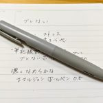 今回ももちろん左利きで実際に書いた文字や使い具合を紹介。とんがっていないボールペンは左利きにもとんがらないで!という思いを込めて期待したい。